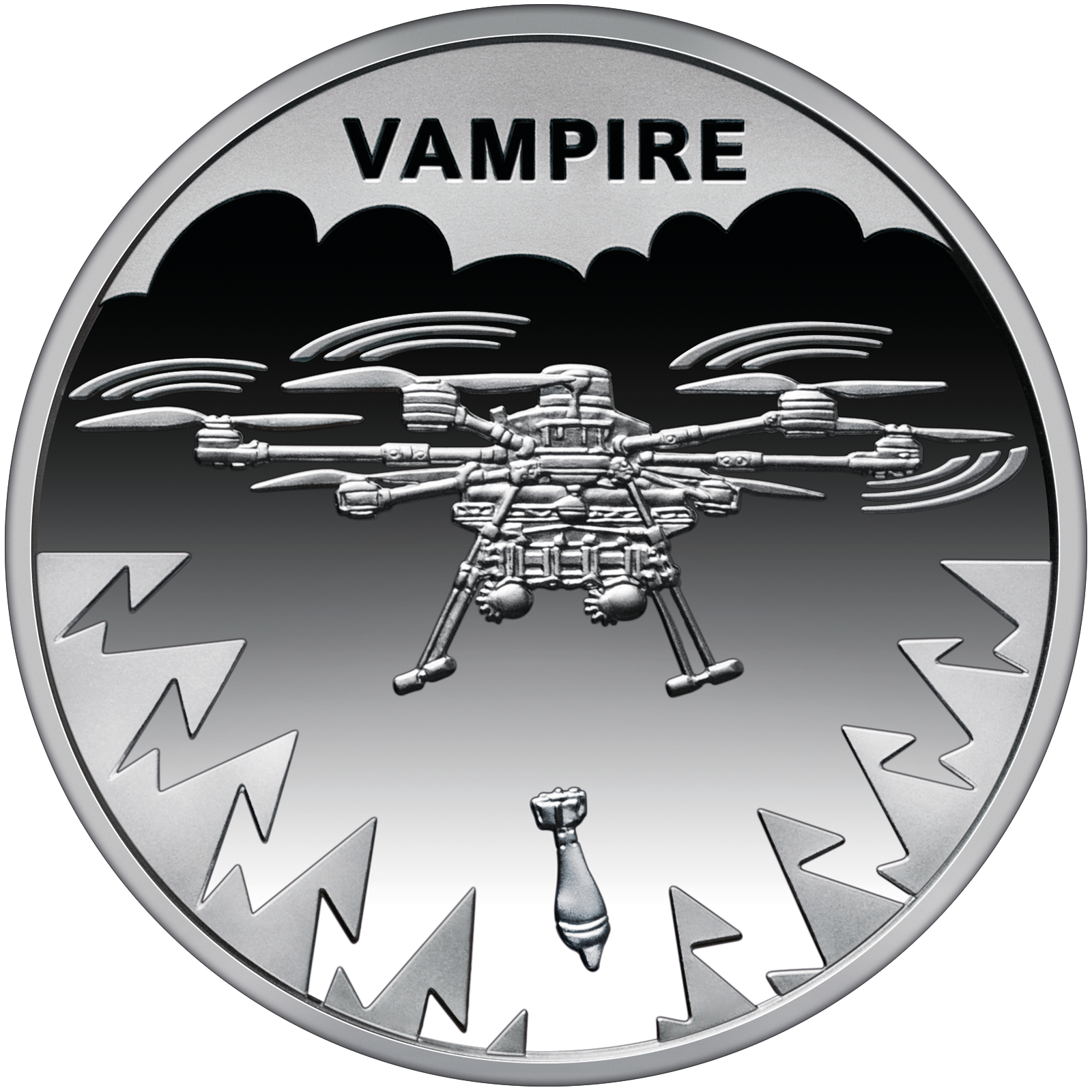 На реверсі монети зображено гексакоптер “Vampire” у ключовий момент виконання бойового завдання – у польоті під час скидання боєприпасу. Фоном для центрального елемента слугує стилізована хмара, з якої викрешуються блискавки, що символізують міць, швидкість та невідворотність ударів, завдаваних цим безпілотником. У верхній частині монети – напис VAMPIRE. |