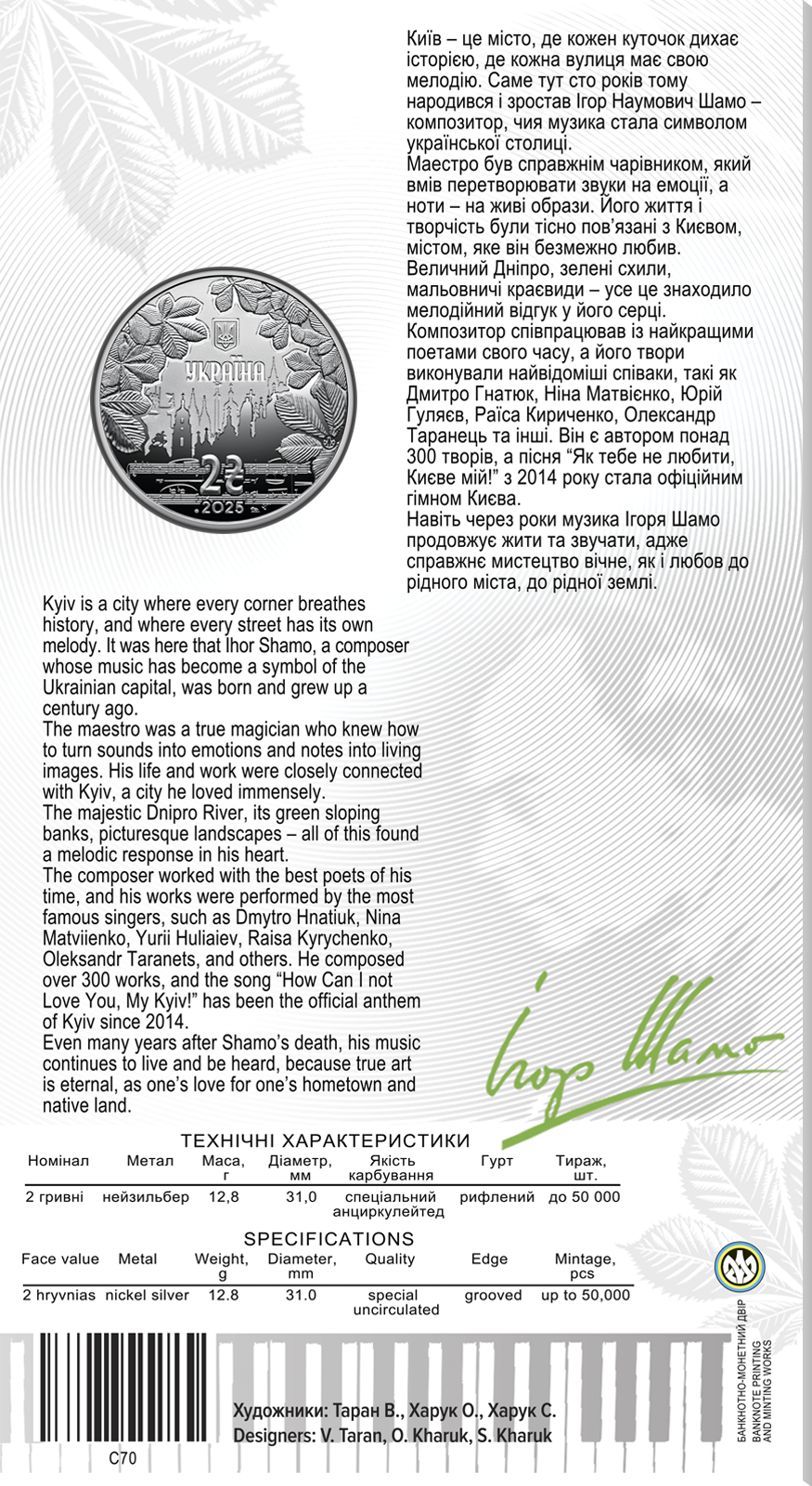 | На аверсі монети зображено стилізовану композицію мальовничих краєвидів, знакових будівель та пам’ятників міста Києва, обрамлених листям каштанів – символічною візитівкою столиці. Нижче на дзеркальному тлі розміщено: нотний стан із записом музичного твору Ігоря Шамо, номінал 2 з графічним символом гривні та рік карбування – 2025. У центрі вгорі розташовано малий Державний Герб України та напис УКРАЇНА (крапки над літерою “ї” зображено у формі сердець). Унизу праворуч зазначено логотип Банкнотно-монетного двору Національного банку України. |
