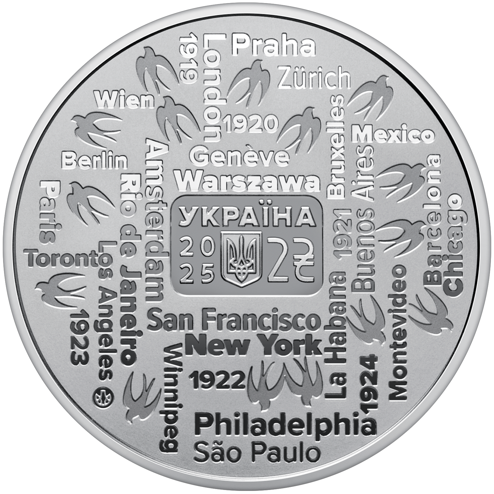 | На аверсі монети розміщено композицію, що символізує гастрольну діяльність Української республіканської капели під орудою Олександра Кошиця. На матовому тлі відтворено стилізовану карту гастрольного маршруту, на якій позначено назви міст, де виступала капела. Між назвами міст зображено силуети ластівок – метафора духовного польоту, вільного руху та поширення українського мистецтва у світі. На дзеркальному тлі розміщено: напис УКРАЇНА, рік карбування 20 / 25, малий Державний Герб України, номінал 2 з графічним знаком гривні. Унизу ліворуч зазначено логотип Банкнотно-монетного двору Національного банку України. |