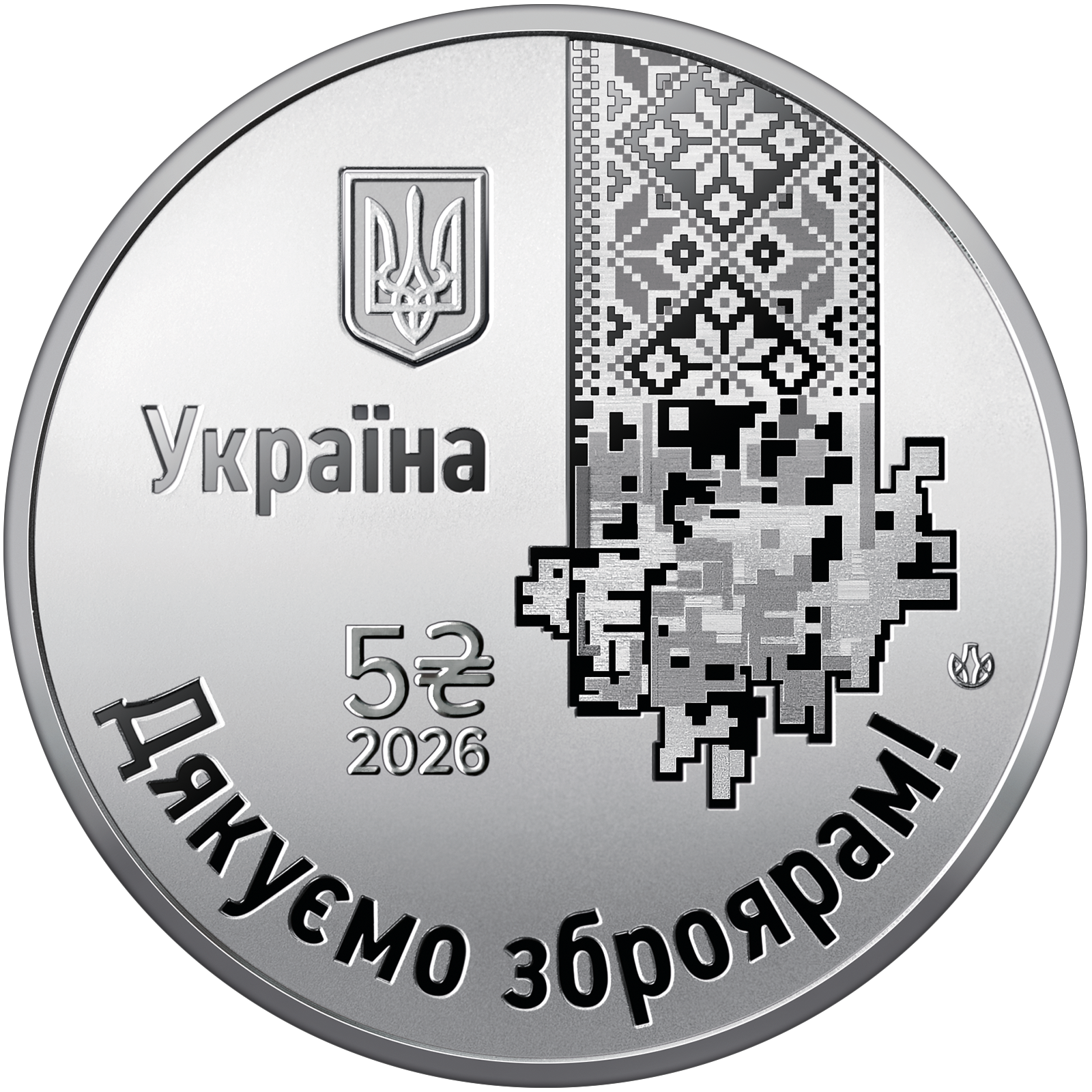 На аверсі монети зображено традиційний орнамент української вишивки, що переходить у "піксель". Таке поєднання відображає еволюцію української сили – від спадщини минулого до інновацій сьогодення. У верхній частині композиції ліворуч зазначено: малий Державний Герб України, напис УКРАЇНА, номінал 5 та графічний знак гривні, рік карбування монети – 2026. Праворуч розміщено логотип Банкнотно-монетного двору Національного банку України. Унизу монети – напис ДЯКУЄМО ЗБРОЯРАМ!.
