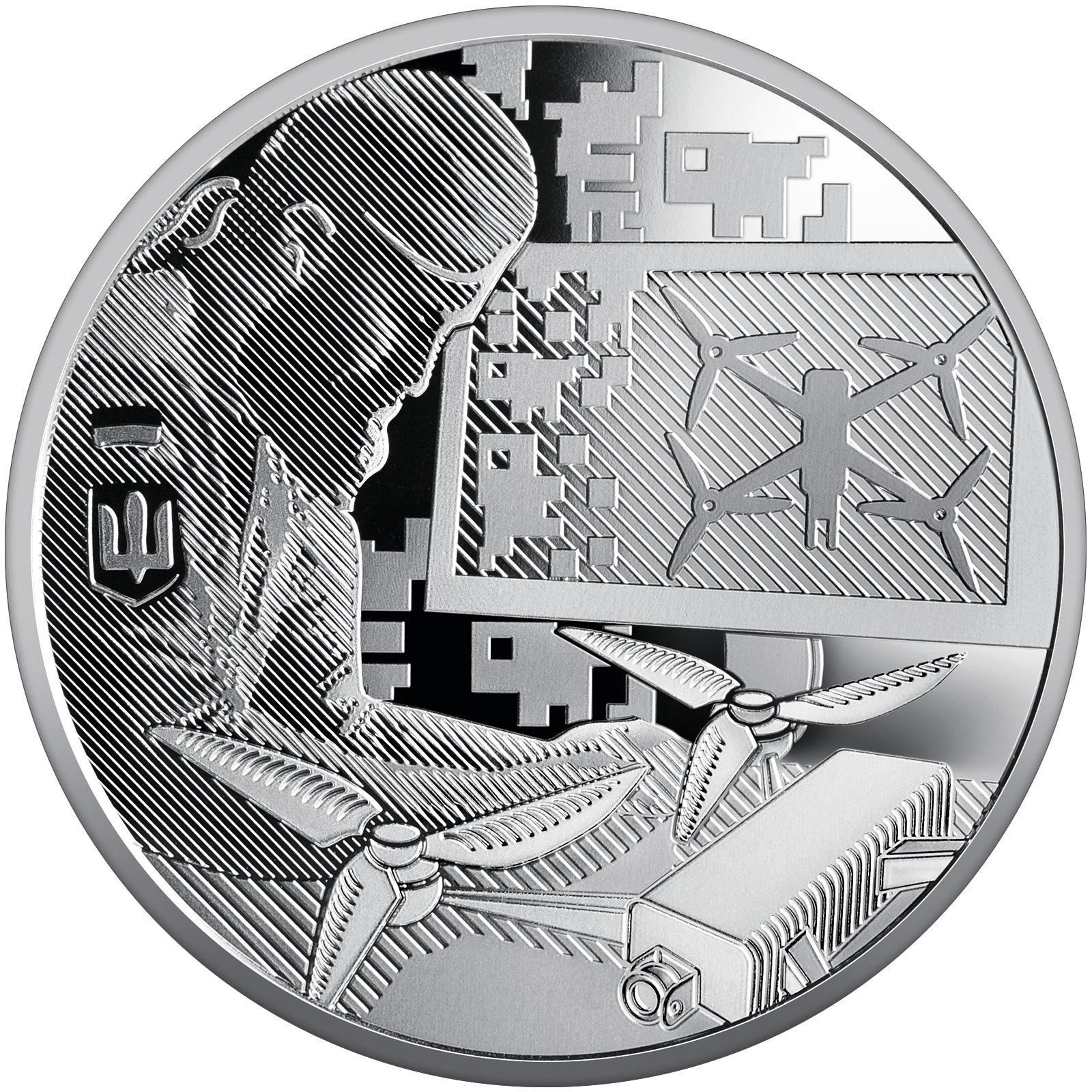 На реверсі монети зображено постать українського зброяра, зосередженого на створенні одного з найефективніших на сьогодні видів озброєння – БпЛА. Це збірний образ українських інженерів, конструкторів та інших технічних спеціалістів, чиї знання, ідеї та інновації перетворюються на інструменти захисту держави. Їхня робота не щодня потрапляє до фронтових хронік, але суттєво впливає на перебіг війни.