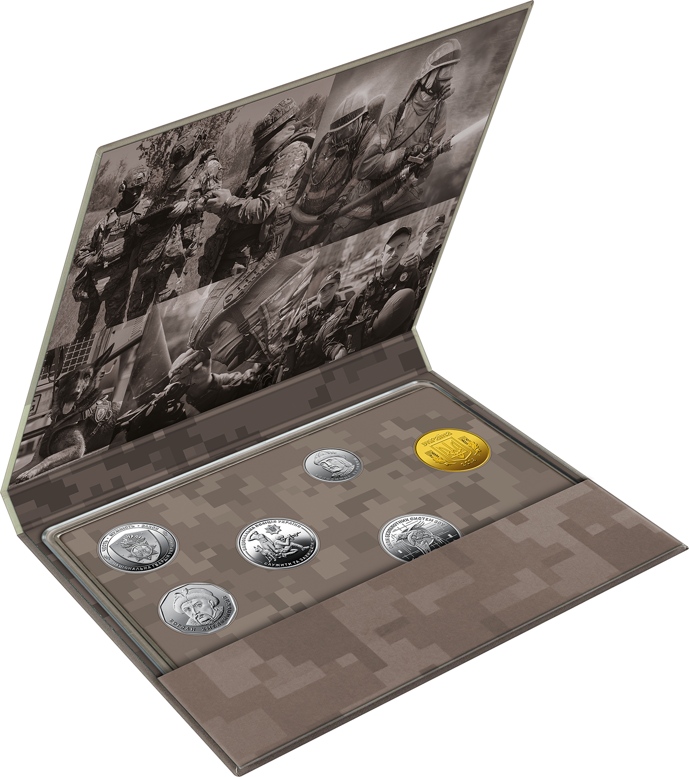 | До набору входять: розмінна монета номіналом 50 копійок, обігові монети номіналами 1, 2, 5, 10 гривень та обігові пам’ятні монети номіналом 10 гривень – “Національна гвардія України”, “Сили безпілотних систем Збройних Сил України”, “Національна поліція України”, “Державна служба України з надзвичайних ситуацій”. |