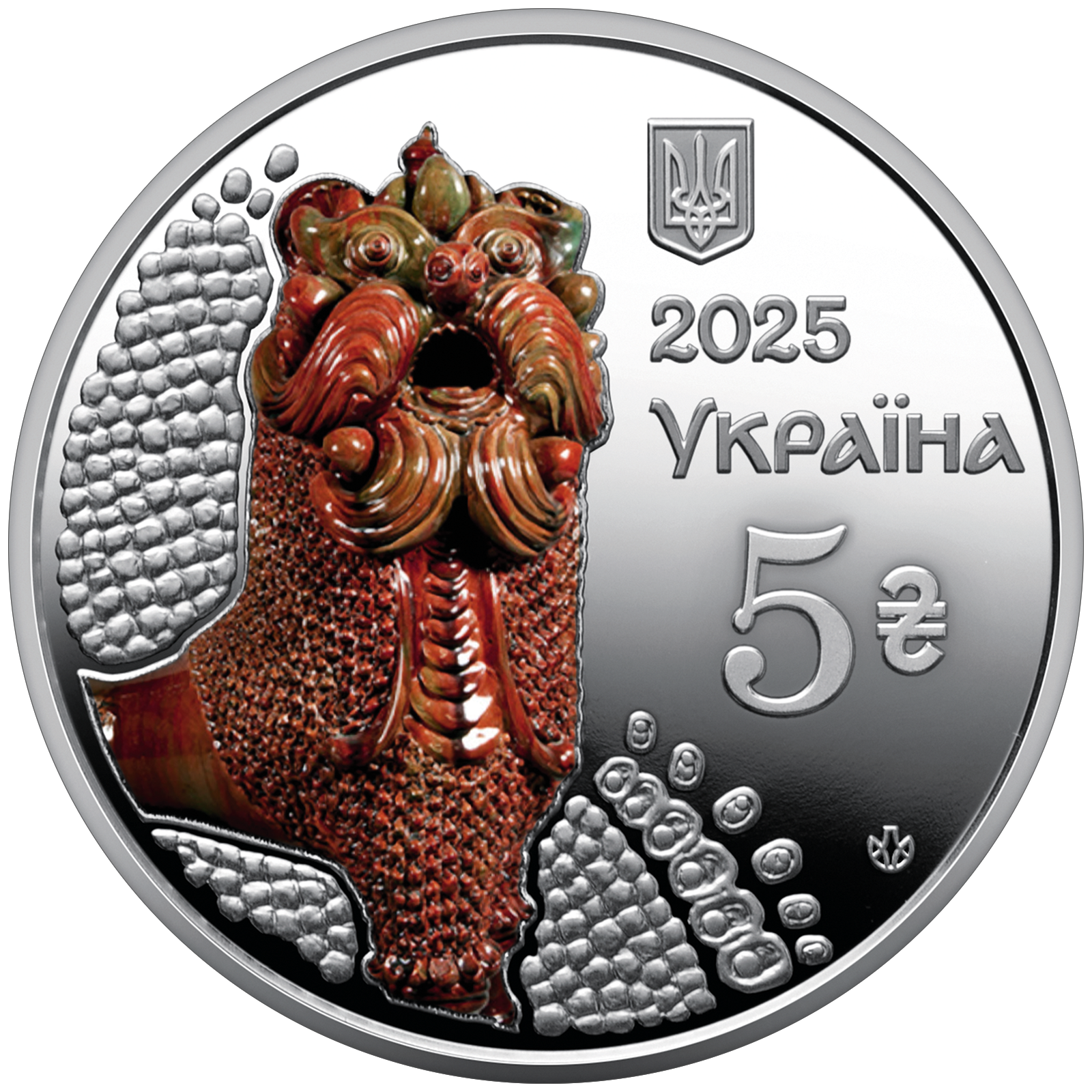 | На аверсі монети в центрі композиції зображено зооморфну скульптуру “Лев” авторства Василя Омеляненка (елемент оздоблення – кольоровий друк). Обабіч скульптури розміщено фрагменти характерного наліпного декору зооморфної скульптури. Праворуч – малий Державний Герб України, рік карбування 2025, напис УКРАЇНА, номінал 5 та графічний знак гривні, а також логотип Банкнотно-монетного двору Національного банку України. |