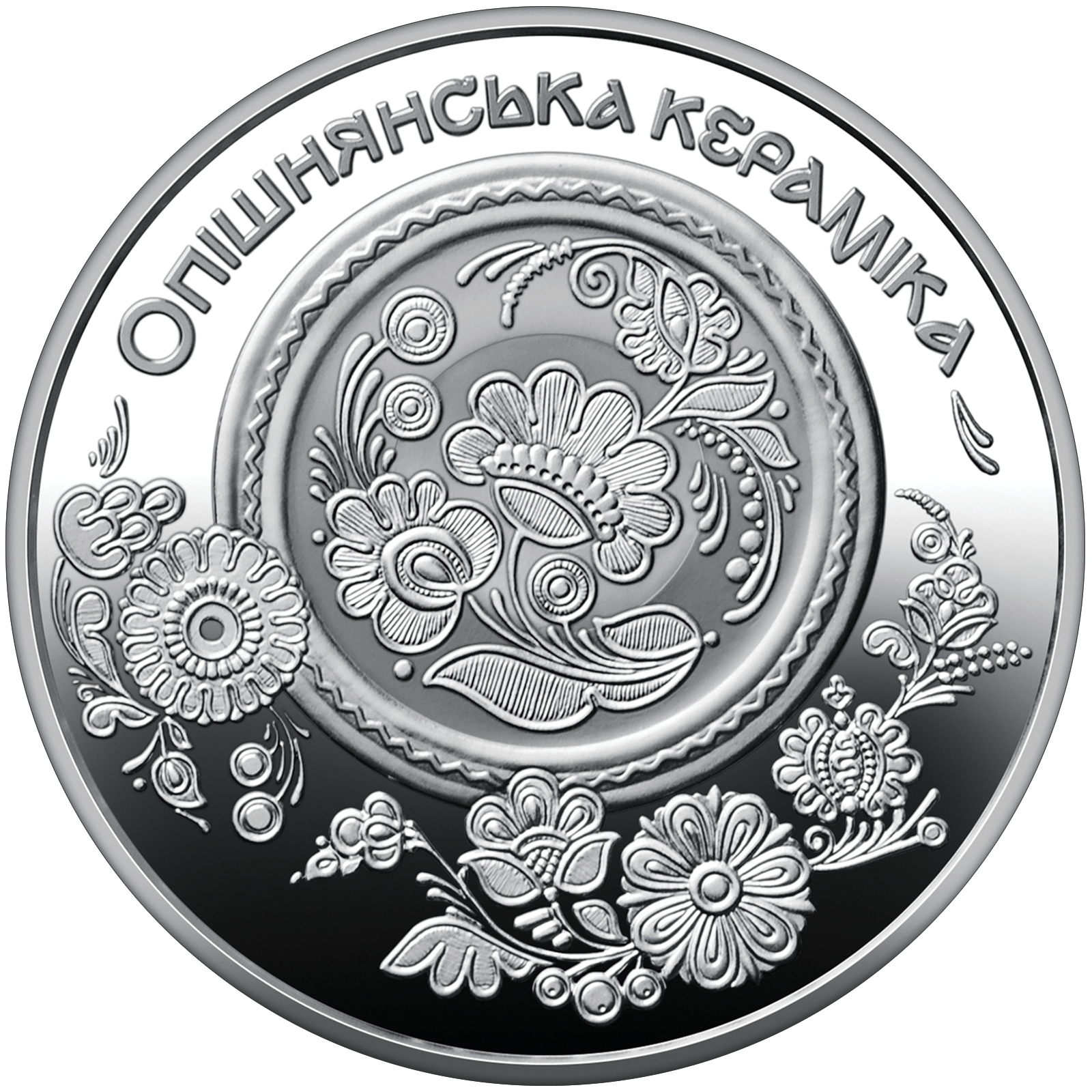 На реверсі монети представлена стилізована композиція, сформована з елементів традиційного орнаментального декору опішнянських глиняних виробів, зокрема тарелей – справжніх перлин українського народного мистецтва, які ніби виходять за межі однієї з них. У верхній частині монети – напис ОПІШНЯНСЬКА КЕРАМІКА. |