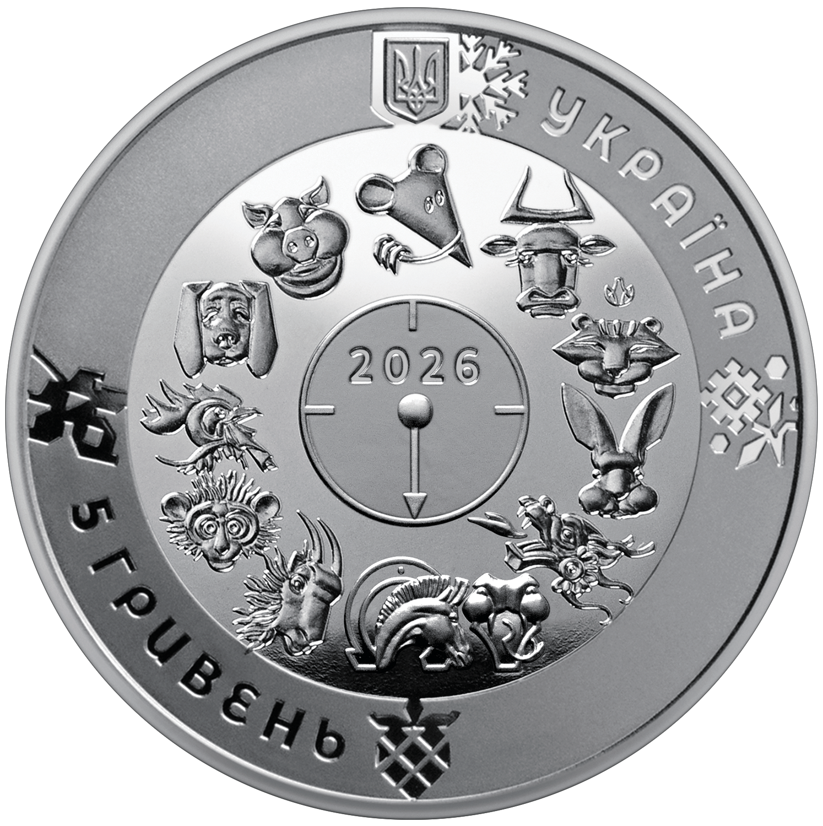 | На аверсі монети розміщено: угорі – малий Державний Герб України, праворуч від якого напис півколом УКРАЇНА; на дзеркальному тлі по колу зображені 12 символів східного календаря, у центрі кола – стилізований годинник зі стрілкою, що вказує на коня – символ року, над стрілкою – 2026; унизу ліворуч напис півколом 5 ГРИВЕНЬ; на матовому тлі зображені стилізовані під українську витинанку символи кожної пори року: сніжинка (угорі), квітка (праворуч), ягода (унизу), листок (ліворуч); логотип Банкнотно-монетного двору Національного банку України (праворуч над символом тигра). |