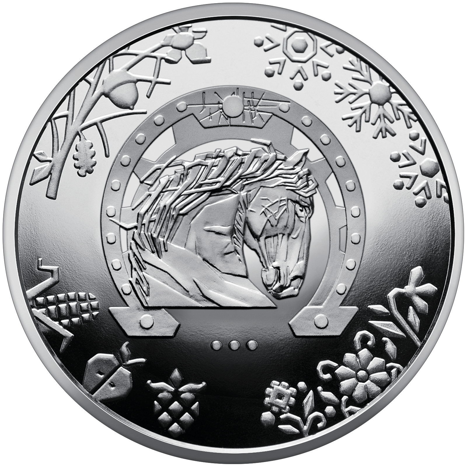 На реверсі монети в центрі композиції окремо зображено символ 2026 року – стилізованого коня на тлі підкови, що традиційно асоціюється з удачею та захистом. Грива коня передає динаміку руху “за вітром” або “проти вітру” – як метафора внутрішньої сили, спротиву та прагнення до свободи. Під центральним зображенням розміщено три крапки, які символізують продовження боротьби. По колу кінь оточений стилізованими елементами, які характерні кожній порі року: сніжинки (угорі праворуч), квітки (унизу праворуч), плоди (унизу ліворуч), гілки (угорі ліворуч). |