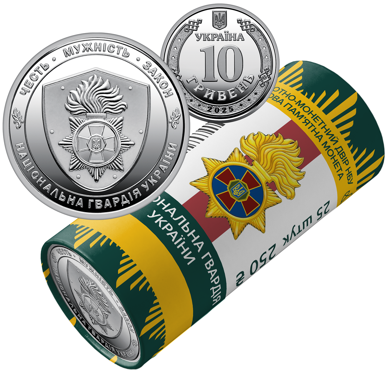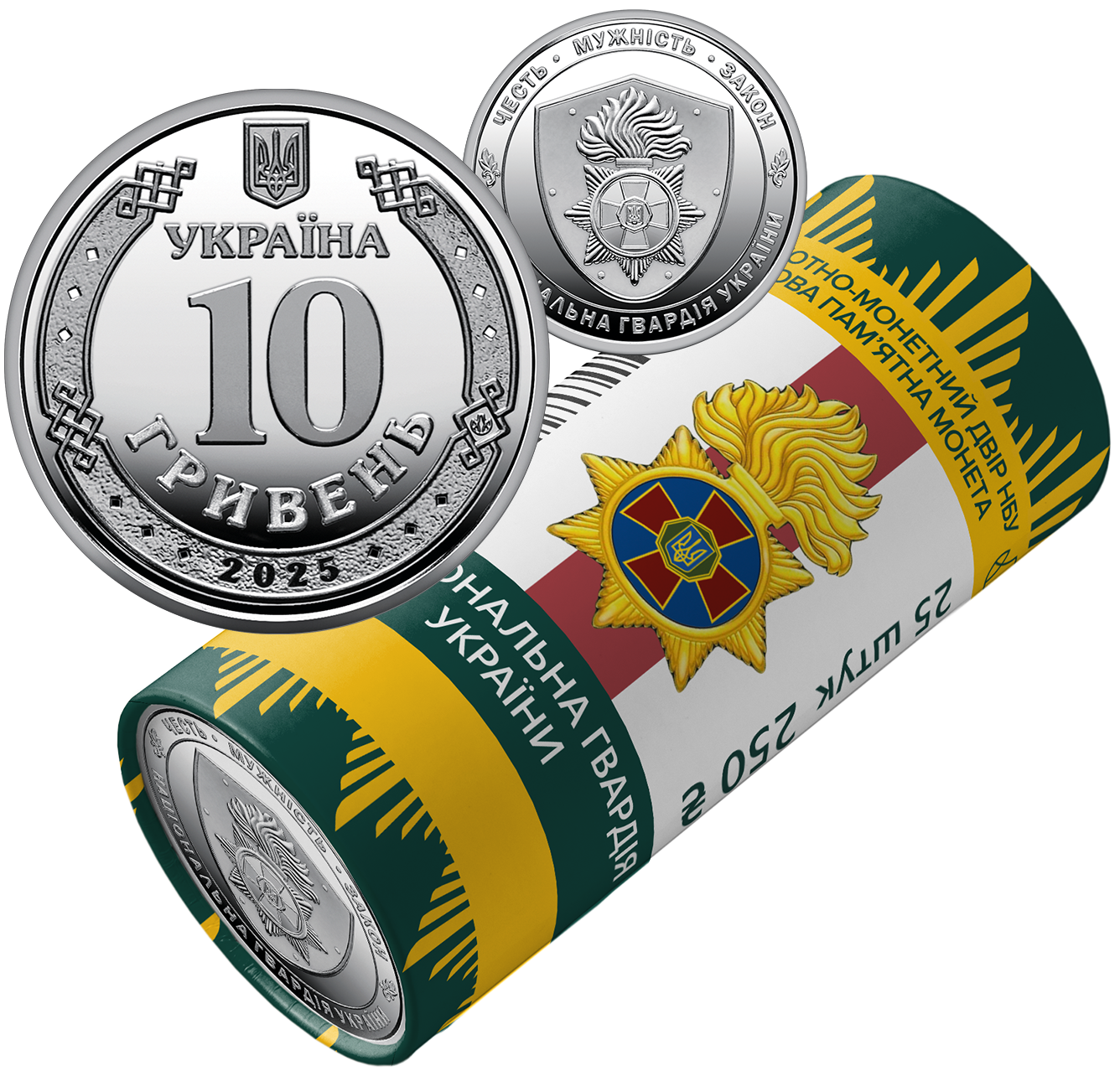 Ролик обігових пам’ятних монет “Національна гвардія України” присвячено військовому формуванню, що поєднує бойові та правоохоронні функції і входить до системи Міністерства внутрішніх справ України. Ця монета вшановує внесок нацгвардійців у захист суверенітету, територіальної цілісності, громадського порядку та безпеки України, символізуючи честь, мужність і непохитну вірність закону. На сувенірному папері, у який запаковано кожний ролик, розміщено написи: БАНКНОТНО-МОНЕТНИЙ ДВІР НБУ, ОБІГОВА ПАМ’ЯТНА МОНЕТА, НАЦІОНАЛЬНА ГВАРДІЯ УКРАЇНИ, 25 ШТУК, номінал 250 та графічний символ гривні; логотип Банкнотно-монетного двору Національного банку України, зображення беретного знака Національної гвардії України на тлі символічного щита.