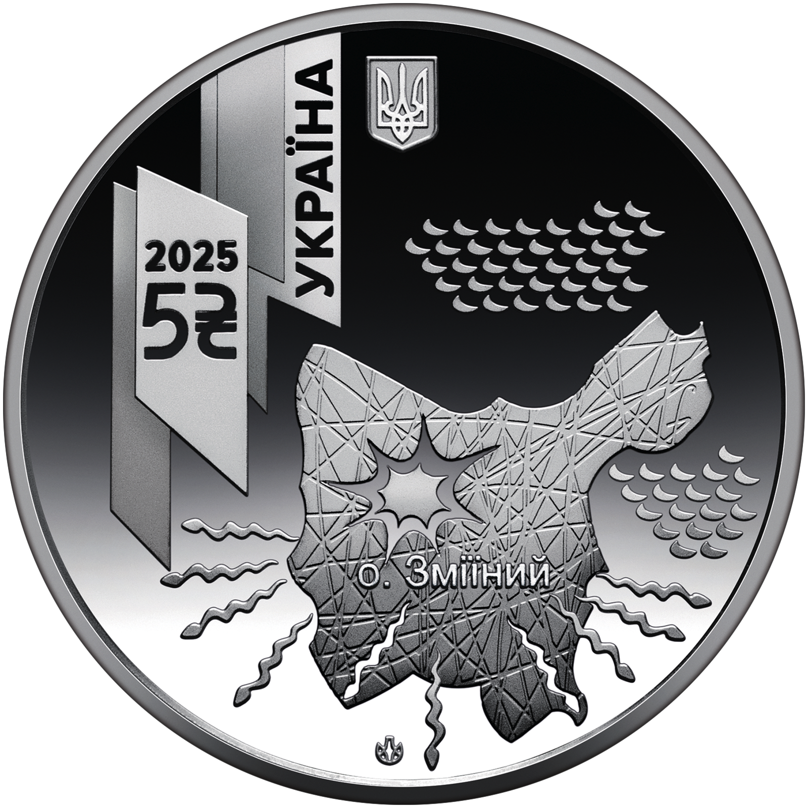 | На аверсі монети на дзеркальному тлі зображено абрис острова Зміїний, який було успішно звільнено за підтримки САУ “Богдана”. Поблизу острова – стилізовані змії, які залишають територію, як символ відступу ворога. Угорі монети – малий Державний Герб України; ліворуч на блискавкоподібних зигзагах, що уособлюють потужність ударів артилерії, розташовані написи: УКРАЇНА (вертикально), рік карбування монети – 2025, а також номінал 5 та графічний знак гривні. Унизу по центру зазначено логотип Банкнотно-монетного двору Національного банку України. |