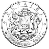 На аверсі монети в намистовому колі зображено увінчану вінцем композицію, що втілює ідею соборності України: малий Державний Герб України в оточенні рослинного орнаменту підтримують лев та козак з мушкетом і кругові написи: УКРАЇНА, 5 ГРИВЕНЬ, 2001 р. та логотип Монетного двору Національного банку України |