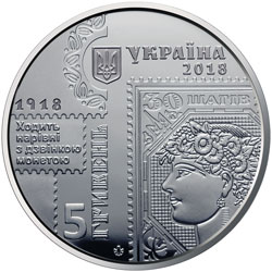 На аверсі монети розміщено: малий Державний Герб України, праворуч від якого написи УКРАЇНА/2018, під якими відтворено фрагмент марки 30 шагів, ліворуч - номінал монети 5 ГРИВЕНЬ (вертикальний напис) та написи: 1918, ХОДИТЬ/НАРІВНІ/З ДЗВІНКОЮ/МОНЕТОЮ; логотип Банкнотно-монетного двору Національного банку України (унизу). |