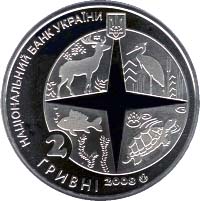 На аверсі монети зображено композицію - коло, що розділене розою вітрів на чотири частини, кожна з яких символізує класи ссавців, птахів, риб, земноводних, які представлені в зоопарку; угорі - малий Державний Герб України та розміщено написи НАЦІОНАЛЬНИЙ БАНК УКРАЇНИ (ліворуч півколом), унизу - 2/ ГРИВНІ 2008 та логотип Монетного двору Національного банку України. |