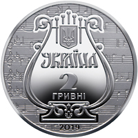 На аверсі монети розміщено стилізовану композицію: на тлі нотних рядків зображено музичний інструмент – ліру, угорі якої – малий Державний Герб України, під ним написи: УКРАЇНА/2/ГРИВНІ; унизу: логотип Банкнотно-монетного двору Національного банку України та рік карбування монети – 2019. |