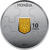 На аверсі монети на матовому тлі складеного пазла, контурами якого є мікротекст із цитатими окремих статей Конституції України, розміщено: позолочений малий Державний Герб України (по центру); написи: УКРАЇНА (угорі), номінал монети – 10/ГРИВЕНЬ (праворуч від герба); рік карбування монети – 2021 (унизу). |