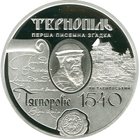 На реверсі монети угорі на дзеркальному тлі розміщено написи: ТЕРНОПІЛЬ/ПЕРША ПИСЕМНА ЗГАДКА, під якими на тлі стилізованого сувою, скріпленого печаткою, зображено портрет Яна Тарновського, праворуч від якого - стародавній замок; написи: ЯН ТАРНОВСЬКИЙ/1540 (праворуч) та ТЯRNOPOLIE (ліворуч). |
