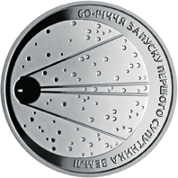 На реверсі монети подано стилізоване зображення супутника Землі та розміщено написи: 60-РІЧЧЯ ЗАПУСКУ ПЕРШОГО СУПУТНИКА ЗЕМЛІ (праворуч півколом). |