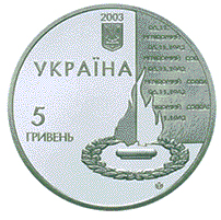 На аверсі монети розміщено: угорі рік карбування монети 2003, під ним малий Державний Герб України та написи у три рядки: УКРАЇНА, 5 ГРИВЕНЬ; праворуч на монетах зображено меморіальну дошку та вічний вогонь,та логотип Монетного двору Національного банку України. |