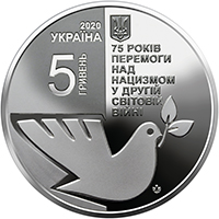 На аверсі монети розміщено: угорі на дзеркальному тлі – малий Державний Герб України, під яким напис – 75 РОКІВ/ ПЕРЕМОГИ/ НАД/НАЦИЗМОМ/ У ДРУГІЙ/ СВІТОВІЙ/ ВІЙНІ; ліворуч на матовому тлі написи: 2020/ УКРАЇНА/ 5 ГРИВЕНЬ (напис ГРИВЕНЬ – вертикальний); унизу на дзеркальному тлі – декоративне зображення голуба, який тримає оливкову гілочку – символ свободи, миру, перемоги. Праворуч унизу розміщено логотип Банкнотно-монетного двору Національного банку України). |