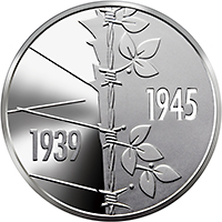 На реверсі монети зображено стилізовану композицію: вертикальний колючий дріт, що ділить площину монети умовно на військову (ліворуч) із потрісканими, рваними краями (котрі символізують напругу, тривогу, біль), на тлі якої напис – 1939, і мирну, де колючий дріт проростає листям (що символізує відродження і продовження життя), на тлі якої напис – 1945. |
