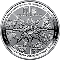 На аверсі монети розміщено: малий Державний Герб України (угорі), написи: УКРАЇНА (під гербом), номінал монети – 5 / ГРИВЕНЬ (праворуч від герба); у центрі – символічне колесо життя, що знаменує відродження природи: стилізований міжнародний знак “Радіаційна загроза”, оповитий листям, навколо якого тварини, популяції яких розвиваються у 30-кілометровій зоні відчуження, що стала своєрідним резерватом для розмноження, зокрема лелеки чорного, коня Пржевальського, рисі, зубра, лося, ведмедя бурого; по колу, на дзеркальному тлі написи: ЧОРНОБИЛЬСЬКИЙ РАДІАЦІЙНО-ЕКОЛОГІЧНИЙ БІОСФЕРНИЙ ЗАПОВІДНИК (ліворуч), CHORNOBYL RADIATION AND ECOLOGICAL BIOSPHERE RESERVE; логотип Банкнотно-монетного двору Національного банку України (угорі); рік карбування – 2024 (унизу). |