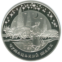На реверсі монети на тлі нічного пейзажу зображено жанрову сцену: чумацькі вози, чумака з люлькою та внизу півколом розміщено напис ЧУМАЦЬКИЙ ШЛЯХ. |