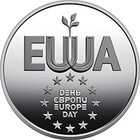 На реверсі монети на дзеркальному тлі розміщено абревіатури EU та UA, які, переплітаючись, створюють візуальний символ єдності України та Європи. Дві літери “U” є ніби одним цілим, формуючи образ нового життя, що проростає під егідою Європейського Союзу. Навколо написів ДЕНЬ / ЄВРОПИ / EUROPE / DAY зображено дванадцять зірок, як і на прапорі ЄС, що символізують єдність, цілісність і гармонію народів Європи. |