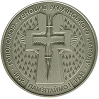 На реверсі монети на тлі запалених свічок зображено хрест з лелекою всередині та по колу розміщено написи: ГОЛОДОМОР - ГЕНОЦИД УКРАЇНСЬКОГО НАРОДУ, 1932 ПАМ`ЯТАЙМО! 1933. |