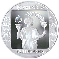 На аверсі монети у квадраті зображено грекиню в туніці, яка тримає в правій руці чашу з голографічним вогнем, у лівій – оливову гілку – давній символ миролюбства. Над квадратом розміщено малий Державний Герб України та напис УКРАЇНА, під квадратом – 20 ГРИВЕНЬ; з обох боків квадрата на тлі античного меандрового орнаменту – позначення металу та його проби – Ag 925, маса в чистоті – 62,2, логотип Монетного двору Національного банку України (ліворуч) та рік карбування монети – 2004 (праворуч).