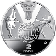 | На аверсі монети розміщено: угорі – написи УКРАЇНА/ 2021, під якими – малий Державний Герб України; у центрі – стилізовану композицію у вигляді медалі на стрічці: зображено Земну кулю, навколо якої написи: УКРАЇНСЬКИЙ БОГАТИР (півколом над кулею), ЧЕМПІОН ЧЕМПІОНІВ (півколом під кулею); номінал монети – 2/ГРИВНІ (унизу на дзеркальному тлі); по обидва боки від центральної композиції – стилізовані сцени боротьби; логотип Банкнотно-монетного двору Національного банку України (унизу праворуч). |