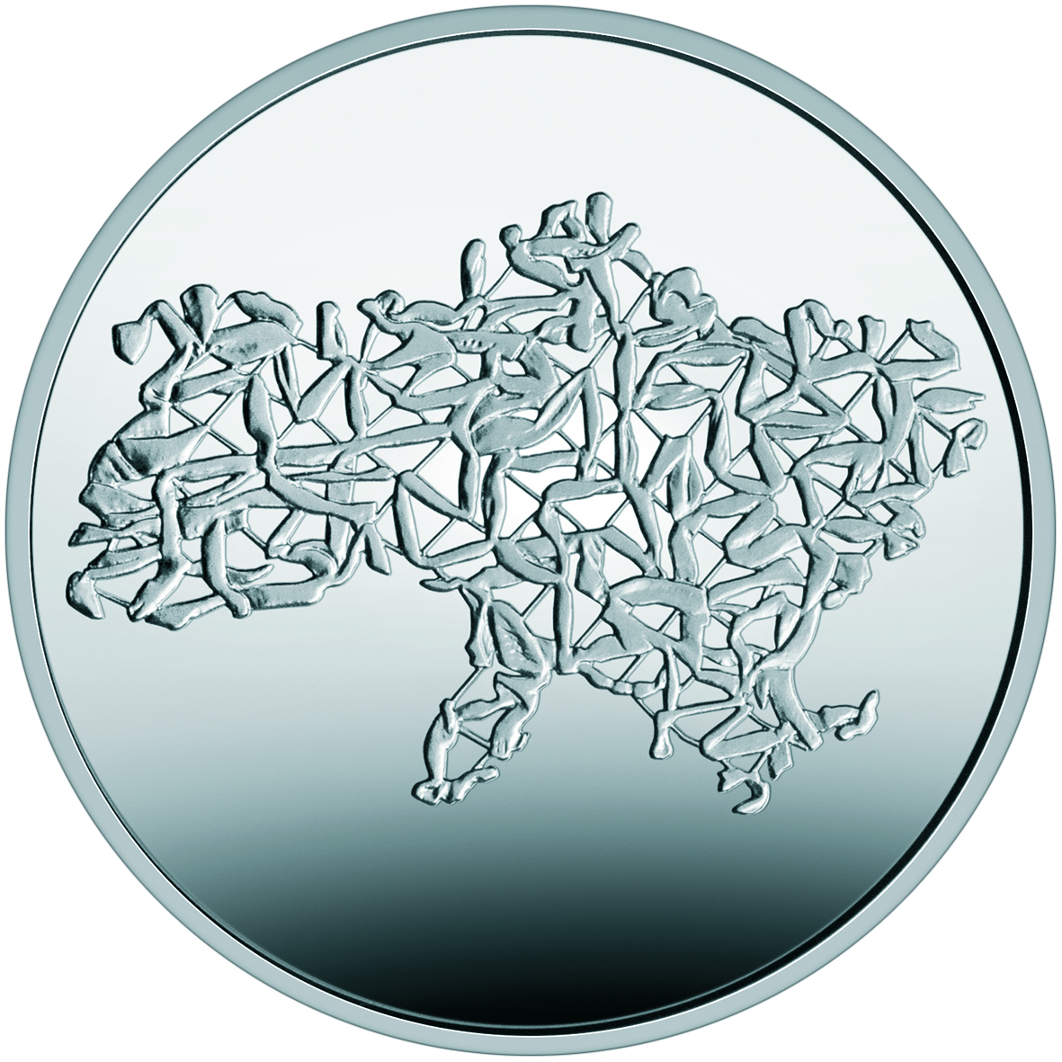 На реверсі монети розміщено стилізовану карту України у вигляді маскувальної сітки як символу об’єднаної країни, що “переплетена” та згуртована задля досягнення спільної мети – Перемоги. |