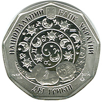 На аверсі монети розміщено: угорі малий Державний Герб України, написи НАЦІОНАЛЬНИЙ БАНК УКРАЇНИ (угорі півколом); номінал ДВІ ГРИВНІ (унизу); стилізовану композицію - на тлі зіркового неба зображення знаків зодіаку, під якими на місяці солодко спить дитина; рік карбування монети 2014 і логотип Монетного двору Національного банку України (праворуч), позначення металу, проби та маси Ag 925/7,78 (ліворуч). |