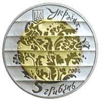 Горизонтально рельєфна поверхня поля аверсу символічно відтворює струни ліри, з яких нібито лунає мелодія у вигляді стилізованого барокового орнаменту. Угорі розміщено малий Державний Герб України, стилізований під козацький шрифт напис Україна; унизу - 5 ГРИВЕНЬ, 2004 (праворуч) та логотип Монетного двору Національного банку України. |