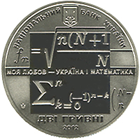 На аверсі монети розміщено: малий Державний Герб України та напис півколом НАЦІОНАЛЬНИЙ БАНК УКРАЇНИ, фрагмент формули М. П. Кравчука, посередині - вислів ученого МОЯ ЛЮБОВ - УКРАЇНА І МАТЕМАТИКА, унизу номінал - ДВІ ГРИВНІ, рік карбування монети - 2012 та логотип Монетного двору Національного банку України. |