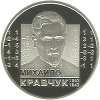 На реверсі монети на тлі цифр, що уособлюють сферу діяльності математика, зображено портрет та написи: МИХАЙЛО/КРАВЧУК, роки життя 1892/1942 (праворуч). |
