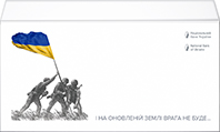 Угорі тексти українською і англійською мовами: 24 ЛЮТОГО 2022 РОКУ / ПОВНОМАСШТАБНИМ ВТОРГНЕННЯМ / РОСІЙСЬКОЇ АРМІЇ РОЗПОЧАВСЯ НОВИЙ ЕТАП / ЗБРОЙНОЇ АГРЕСІЇ ПРОТИ УКРАЇНИ. / НАРОДНА ВІЙНА ЗА НЕЗАЛЕЖНІСТЬ І / СУВЕРЕНІТЕТ УКРАЇНИ ТРИВАЄ З 2014 РОКУ. / ЦЕ ТАКОЖ ВІЙНА ЗА ЦИВІЛІЗАЦІЙНИЙ ВИБІР: / УКРАЇНА ВІДСТОЮЄ СВОЮ ПРИНАЛЕЖНІСТЬ / ДО ЄВРОПЕЙСЬКОЇ ЦИВІЛІЗАЦІЇ І ВОДНОЧАС – / ТІ ЗАСАДНИЧІ ЦІННОСТІ, ПРАВА / І СВОБОДИ, ЩО ЛЕЖАТЬ В ОСНОВІ / ЗАХІДНОГО СВІТУ. (ліворуч); ON 24 FEBRUARY 2022, / A NEW STAGE OF ARMED AGRRESSION AGAINST / UKRAINE BEGAN WITH A FULL-SCALE INVASION / OF UKRAINE BY THE RUSSIAN ARMY. / THE PEOPLE’S WAR FOR THE INDEPENDENCE / AND SOVEREIGNTY OF UKRAINE HAS BEEN / GOING ON SINCE 2014. THIS IS ALSO A WAR FOR / A CIVILIZATIONAL CHOICE: UKRAINE IS DEFENDING / ITS PLACE IN EUROPEAN CIVILIZATION, AND AT THE / SAME TIME FIGHTING FOR THE FUNDAMENTAL / VALUES, RIGHTS AND FREEDOMS THAT UNDERPIN / THE WESTERN WORLD. (праворуч); між текстами – лавровий вінок.