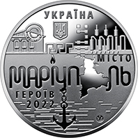 На аверсі медалі розміщено: угорі напис УКРАЇНА, під яким малий Державний Герб України; композицію, що символізує місто-герой: фасад драматичного театру під прицілом (ліворуч), стилізовані конструкції Азовсталі, на які летять бомби (праворуч); на матовому тлі дзеркальні написи: МІСТО/ МАРІУПОЛЬ/ГЕРОЇВ/2022, у написанні слова “Маріуполь” літеру “і” заміняє свічка як символ пам’яті за загиблими, літеру “о” імітує карта міста, створена з двох профілів – дитячого та дорослого, як символ примусової депортації; унизу на тлі стилізованих хвиль зображено якір – один з геральдичних елементів, що є на гербі Маріуполя, як образ надії на звільнення та відродження українського міста; логотип Банкнотно-монетного двору Національного банку України (унизу праворуч). |