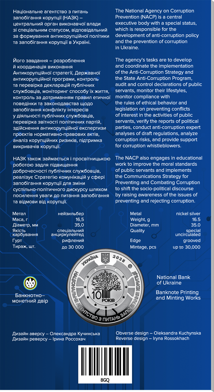 Пам’ятна медаль присвячена десятиріччю створення цього антикорупційного органу. Національне агентство з питань запобігання корупції (НАЗК) – центральний орган виконавчої влади України зі спеціальним статусом, який відповідає за формування антикорупційної політики та запобігання корупції в Україні. Орган створено в 2015 році як частину антикорупційної інфраструктури держави. Пам’ятна медаль є символом визнання важливості роботи НАЗК у сфері протидії та запобігання корупції в Україні й присвячена його досягненням за десять років роботи