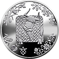 На реверсі монети зображено стилізований символ східного календаря 2021 року – бика, якого оточують по колу стилізовані символи, притаманні кожній порі року: сніжинки (угорі праворуч), квітки (унизу праворуч), плоди (унизу ліворуч), гілки (угорі ліворуч). |