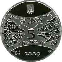 На аверсі монети в оточенні стилізованого рослинного орнаменту розміщено написи: НАЦІОНАЛЬНИЙ БАНК/ УКРАЇНИ/ 5/ ГРИВЕНЬ; угорі - малий Державний Герб України, унизу - рік карбування монети 2009, а також позначення металу, його проби - Ag 925, маси в чистоті - 15,55 та логотип Монетного двору Національного банку України. |