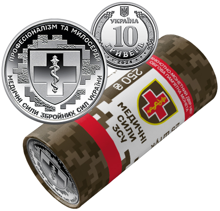діагностики, співпрацюють із найкращими медичними центрами світу та проводять медико-психологічну реабілітацію військовослужбовців. На сувенірному папері, у який запаковано кожний ролик, розміщено написи: БАНКНОТНО-МОНЕТНИЙ ДВІР НБУ, ОБІГОВА ПАМ’ЯТНА МОНЕТА, МЕДИЧНІ СИЛИ ЗСУ, 25 ШТУК, номінал 250 та графічний символ гривні; логотип Банкнотно-монетного двору Національного банку України, зображення емблеми Командування Медичних сил ЗСУ, елементи піксельного камуфляжу.