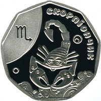 На реверсі монети зображено стилізовану композицію - ліворуч на матовому тлі символ знака зодіаку Скорпіона, у центрі - скорпіончик, угорі напис - СКОРПІОНЧИК. |