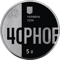 На аверсі монети розміщено напис ЧОРНОБ, у якому перші дві літери стилізовано під число 40, що символічно поєднує часовий вимір трагедії з її назвою, а незавершене зображення букви Б відіграє роль композиційного переходу до реверсу. У верхній частині композиції розміщено малий Державний Герб України, напис УКРАЇНА, рік карбування монети – 2026. Зверху ліворуч зображено логотип Банкнотно-монетного двору Національного банку України. Унизу монети – номінал 5 та графічний знак гривні.