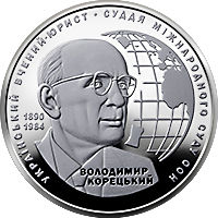 На реверсі монети на тлі глобуса, що символізує міжнародну діяльність українського правознавця В. Корецького, зображено його портрет і написи: ВОЛОДИМИР/ КОРЕЦЬКИЙ (під портретом), роки життя 1890/1984 (ліворуч від портрета), УКРАЇНСЬКИЙ ВЧЕНИЙ-ЮРИСТ СУДДЯ МІЖНАРОДНОГО СУДУ ООН (по колу). |