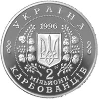 | На аверсі монети в центрі кола, утвореного намистовим узором, знаходиться зображення малого Державного герба України в обрамленні з двох боків гілками калини. Над гербом розміщена дата 1996 - рік карбування монет. По колу монет написи: вгорі УКРАЇНА, внизу у три рядки 2 МІЛЬЙОНИ КАРБОВАНЦІВ. Під щитом державного герба на срібній монеті розміщені позначення і проба дорогоцінного металу Аg 925 та його вага у чистоті 31,1 |