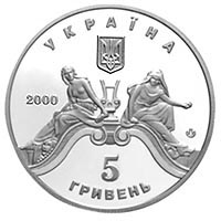 | На аверсі монет угорі розміщено малий Державний Герб України, зображення ліри між скульптурами Комедії та Трагедії, які прикрашають інтер`єр театру, логотип Монетного двору і написи: УКРАЇНА, 2000, 10, ГРИВЕНЬ та позначення металу Ag 925, вага в чистоті - 31,1; |