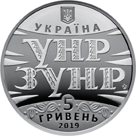 | На аверсі монети розміщено: малий Державний Герб України, під яким напис УКРАЇНА; у центрі на дзеркальному тлі шрифтова композиція із абревіатур УНР/ЗУНР, літери яких декоровані характерними орнаментами; унизу на матовому тлі номінал 5/ ГРИВЕНЬ, по боках від якого стилізований рослинний орнамент, рік карбування монети 2019 (унизу); логотип Банкнотно-монетного двору Національного банку України (праворуч на дзеркальному тлі). |