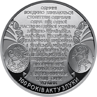 На реверсі монети на дзеркальному тлі розміщено фрагмент Акта Злуки: ОДНИНІ/ВОЄДИНО ЗЛИВАЮТЬСЯ/СТОЛІТТЯМ ОДІРВАНІ/ОДНА ВІД ОДНОЇ/ЧАСТИНИ ЄДИНОЇ УКРАЇНИ -/ ЗАХІДНО-УКРАЇНСЬКА/ НАРОДНА РЕСПУБЛІКА/ (ГАЛИЧИНА, БУКОВИНА/ І УГОРСЬКА УКРАЇНА)/ І НАДДНІПРЯНСЬКА/ВЕЛИКА УКРАЇНА./ ЗДІЙСНИЛИСЬ/ ВІКОВІЧНІ МІРЇ,/ЯКИМИ ЖИЛИ/І ЗА ЯКІ УМИРАЛИ/КРАЩІ СИНИ/ УКРАЇНИ. Латентним зображенням на тексті проглядається зображення Тризуба. Ліворуч і праворуч від напису розміщено медальони із зображеннями символів земель: лева - Західної України (ліворуч) та Архангела Михаїла - центральної України (праворуч), від яких угору йде стилізований рослинний орнамент у вигляді лаврових галузок, унизу напис півколом 100 РОКІВ АКТУ ЗЛУКИ. |