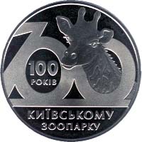 На реверсі монети розміщено стилізований напис ZOO, у якому зображено жирафу та написи 100/років, унизу - КИЇВСЬКОМУ ЗООПАРКУ. |