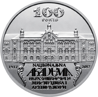 На реверсі монети розміщено: зображення будівлі академії, під якою позначено роки 1917 і 2017; написи: 100 РОКІВ (угорі) та NАЦІОNАЛЬNА АКАДЕМІЯ ОБРАЗОТВОРЧОГО МИСТЕЦТВА І АРХІТЕКТУРИ (унизу). |