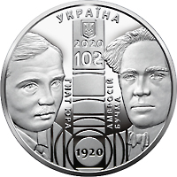 | На аверсі монети розміщено: малий Державний Герб України, над яким напис півколом УКРАЇНА, під гербом – рік карбування монети 2020 та зазначено номінал – 10 та графічний символ гривні; на дзеркальному тлі ліворуч розміщено портрет Гната Юри, праворуч від якого вертикальний напис ГНАТ ЮРА, праворуч – портрет Амвросія Бучми, ліворуч від якого вертикальний напис АМВРОСІЙ/БУЧМА, які були одними з фундаторів театру; унизу зазначено рік заснування театру – 1920. |