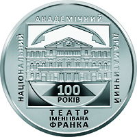 На реверсі монет розміщено композицію, стилізовану під логотип театру: у квадратній рамці на дзеркальному тлі – рельєфне зображення будівлі театру; на матовому тлі – написи: 100/РОКІВ (під будівлею), НАЦІОНАЛЬНИЙ (вертикально ліворуч), АКАДЕМІЧНИЙ (угорі), ДРАМАТИЧНИЙ (вертикально праворуч), ТЕАТР/ІМЕНІ ІВАНА/ФРАНКА (унизу). |